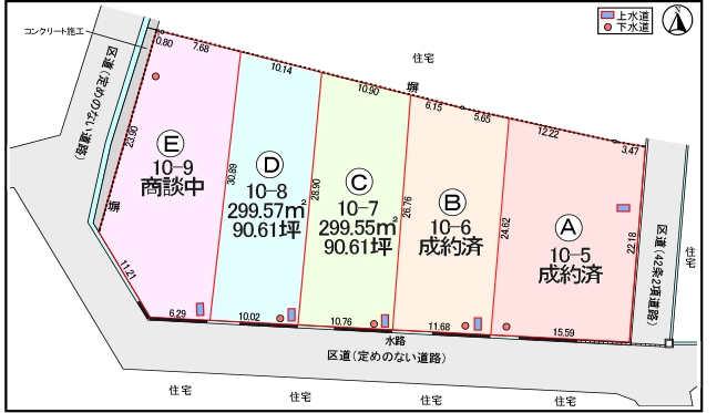 C,Dを販売中です。E区画は商談中、A,Bは成約済みです。